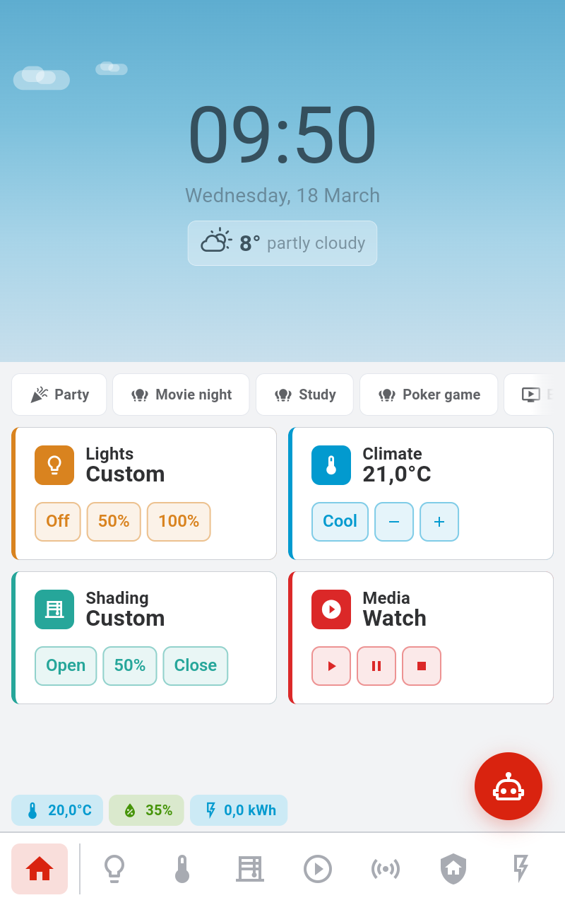 Your starting point — a live snapshot of the room your panel lives in. See the weather, check your sensors, and jump into any domain with a single tap.
